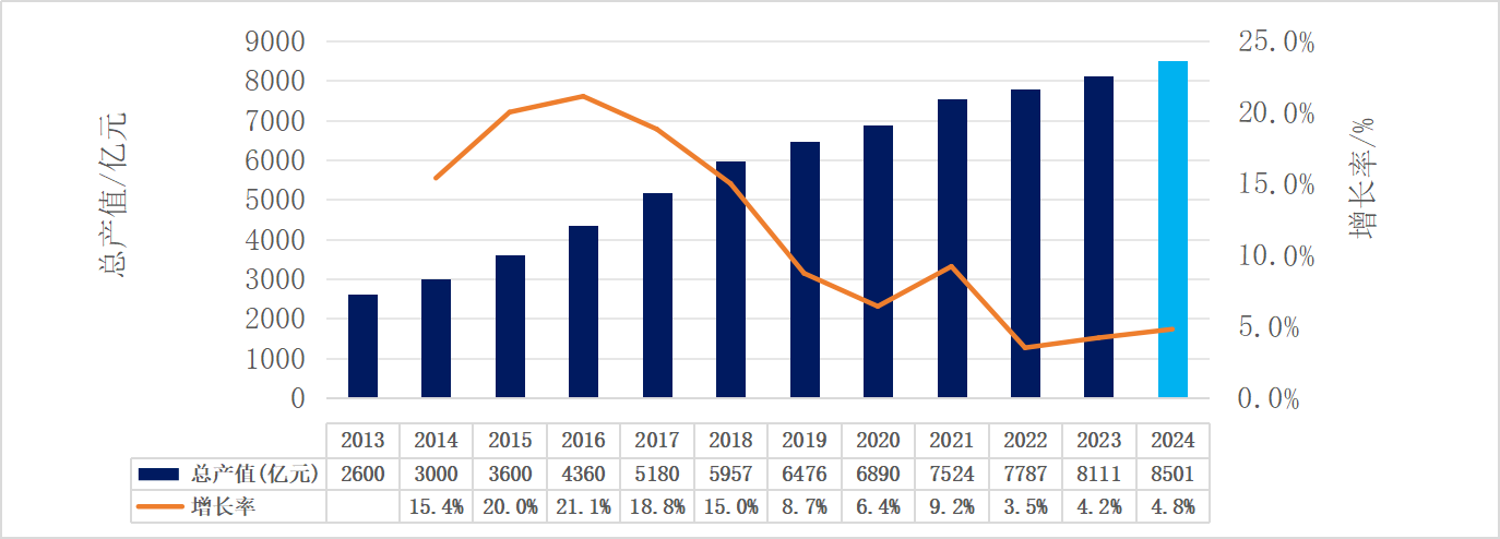 北斗系统与我国地理信息产业相互支撑、深度融合,北斗系统为地理信息产业提供高精度时空基准,地理信息产业推动北斗技术广泛应用和产业化。报告显示,2024年我国地理信息产业总产值超过8500亿元,从业单位超过24万家,从业人员近400万人,产业增速达4.8%,近5年复合增长率为5.6%,近10年复合增长率为11.0%。