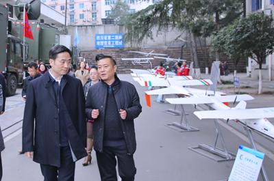 测绘地理信息现代应急装备区,一架架款式不一、大小不等、用途不同的无人机、应急装备车铺开阵势,煞是威风。“这是Z5型无人机,这是指挥系统……”省局测绘应急保障中心的工作人员向甘霖一一介绍不同机型和用途,以及省应急测绘保障体系建设情况,得知该体系的无人机集群灾情地理信息获取系统不久前刚通过成果验收,院士专家们评价为“成果突破一机搭载多载荷与多机协同的集成技术,实现了测绘应急保障与复杂条件下的地理信息获取,整体处于国际先进水平”。甘霖点头称赞,笑着说“好家伙不少啊!”了解到测绘应急保障体系已在芦山地震、尼泊尔地震、“7•9"系列洪灾等重大地质灾害应急救援、灾后重建中发挥了重要作用,他给予了充分肯定,语重心长地勉励大家继续做好应急监测和灾备。