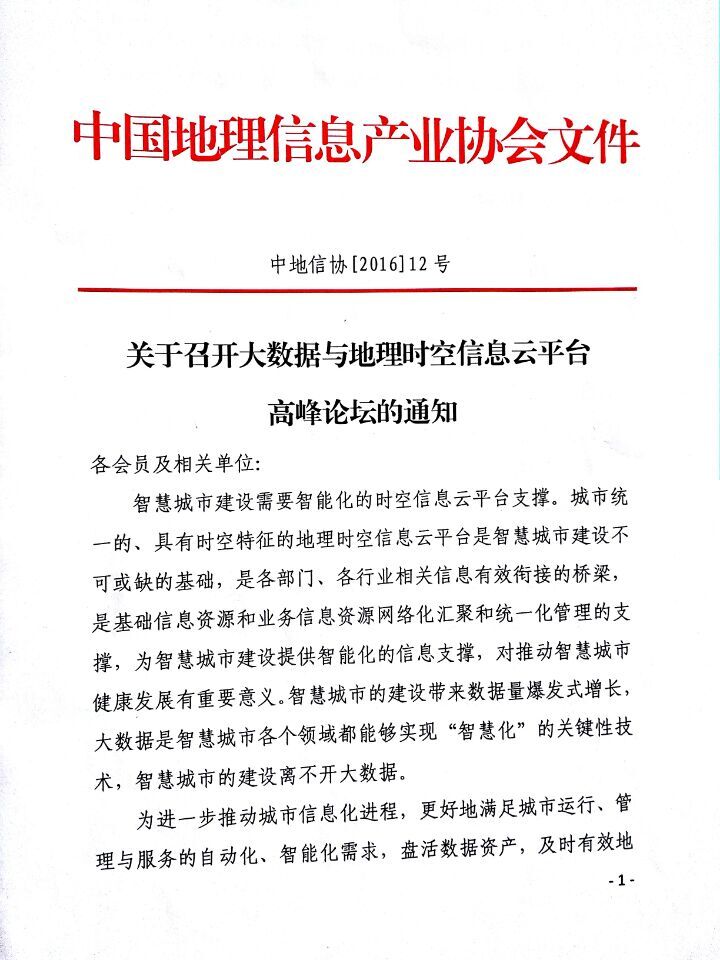 转发中地信协关于召开大数据与地理时空信息云平台高峰论坛的通知