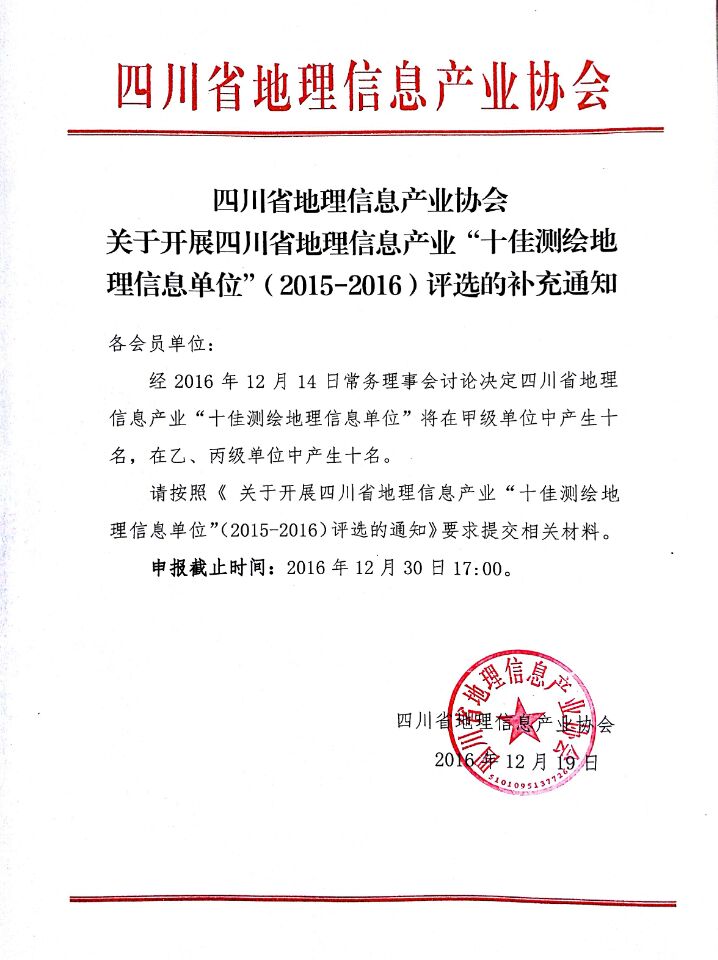 关于开展四川省地理信息产业“十佳测绘地理信息单位”(2015-2016)评选的补充通知